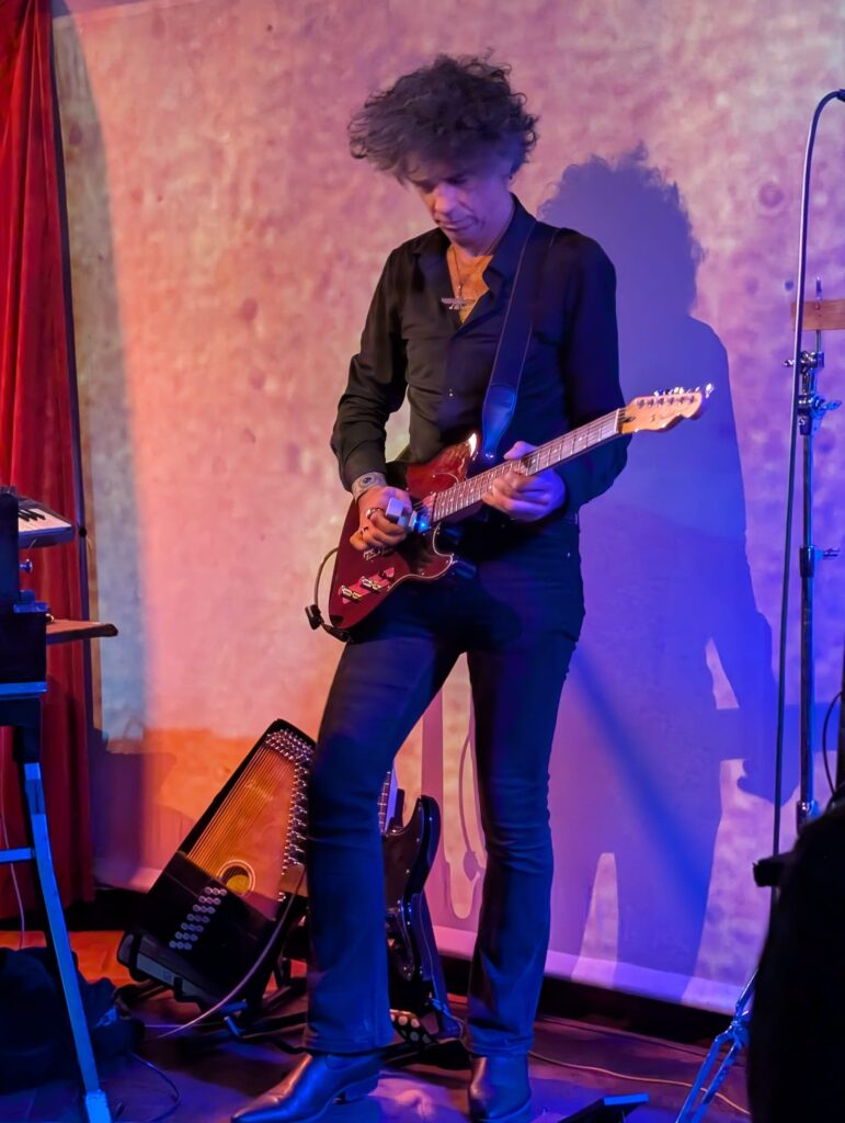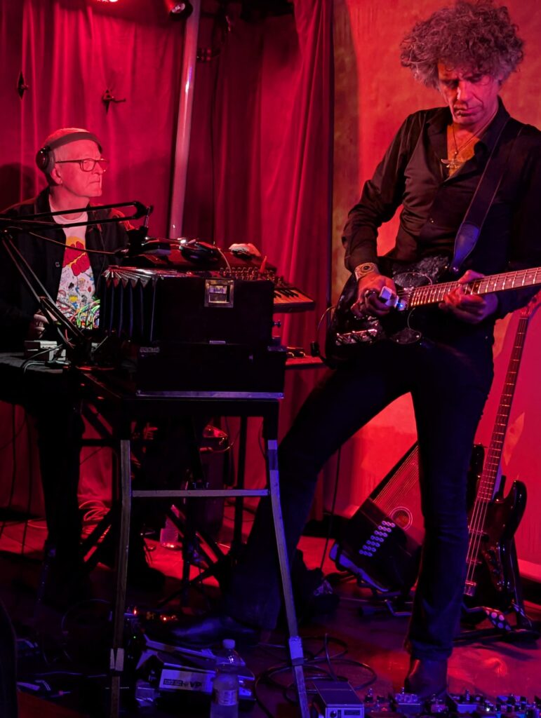 Eventually moving away from the beat heavy rhythms, more ambient noise takes the audience further into a world of neo-psychedelic strangeness, before York adds bagpipes and some of the music takes on a world music atmosphere. This might be a little further out of your average progger’s comfort zone, but within the self-contained Utopia Strong universe, it’s a perfect soundscape, as are the more prog-centric pieces from the set where Kavus adds bursts of chopping rhythm guitar and distorted bass, often bringing togteher influences that sound like ‘Voyage 34’ era Porcupine Tree augmented by Jah Wobble. Among the more electronica themed sounds, there are melodies that veer towards something that sounds like ‘Disaster 2’ (from The Utopia Strong’s 2022 release ‘International Treasure’) as well as a very Arabic sounding phrase where Michael is clearly working very hard to make a woodwind instrument cut through the wall of sound. The way the set is presented makes it very hard to pick out individual tracks, but the stronger melodies of this piece definitely create one of the gig’s stand out moments, and watching the musicians working together creates an almost hypnotic experience.